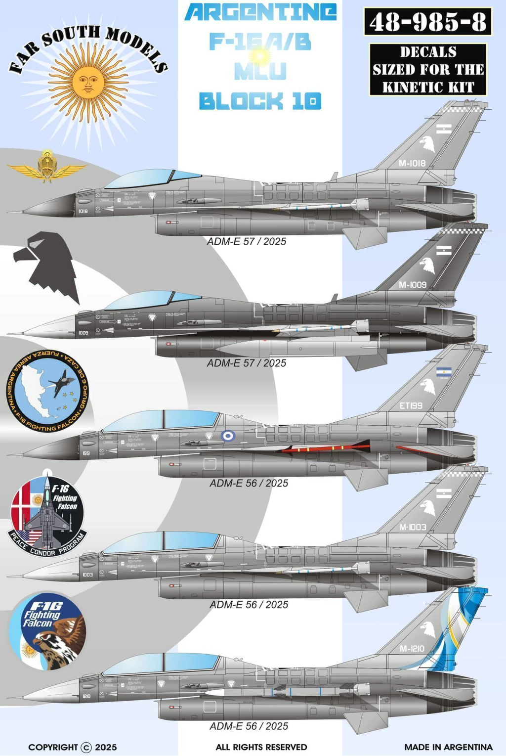 Gran set de calcas de Far South Models 48-985-8, dedicado al F-16 Argentino y con posibilidad de decorar varios kits con distintos esquemas.