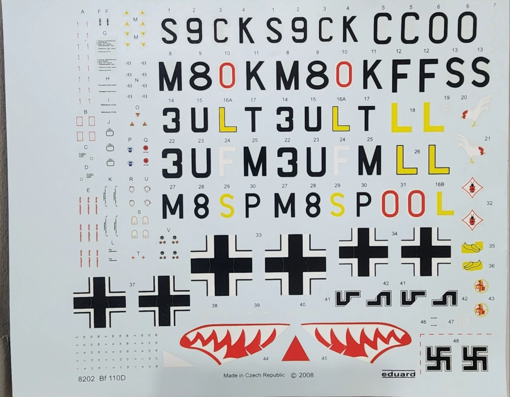Maqueta de segunda mano, piezas del fuselaje y las alas separadas de los sprue para prueba, el resto en sus bolsas, calcas en su mayoria bien, cruces y bocas con rajaduras como se ve en la foto. Caja con algunos detalles.