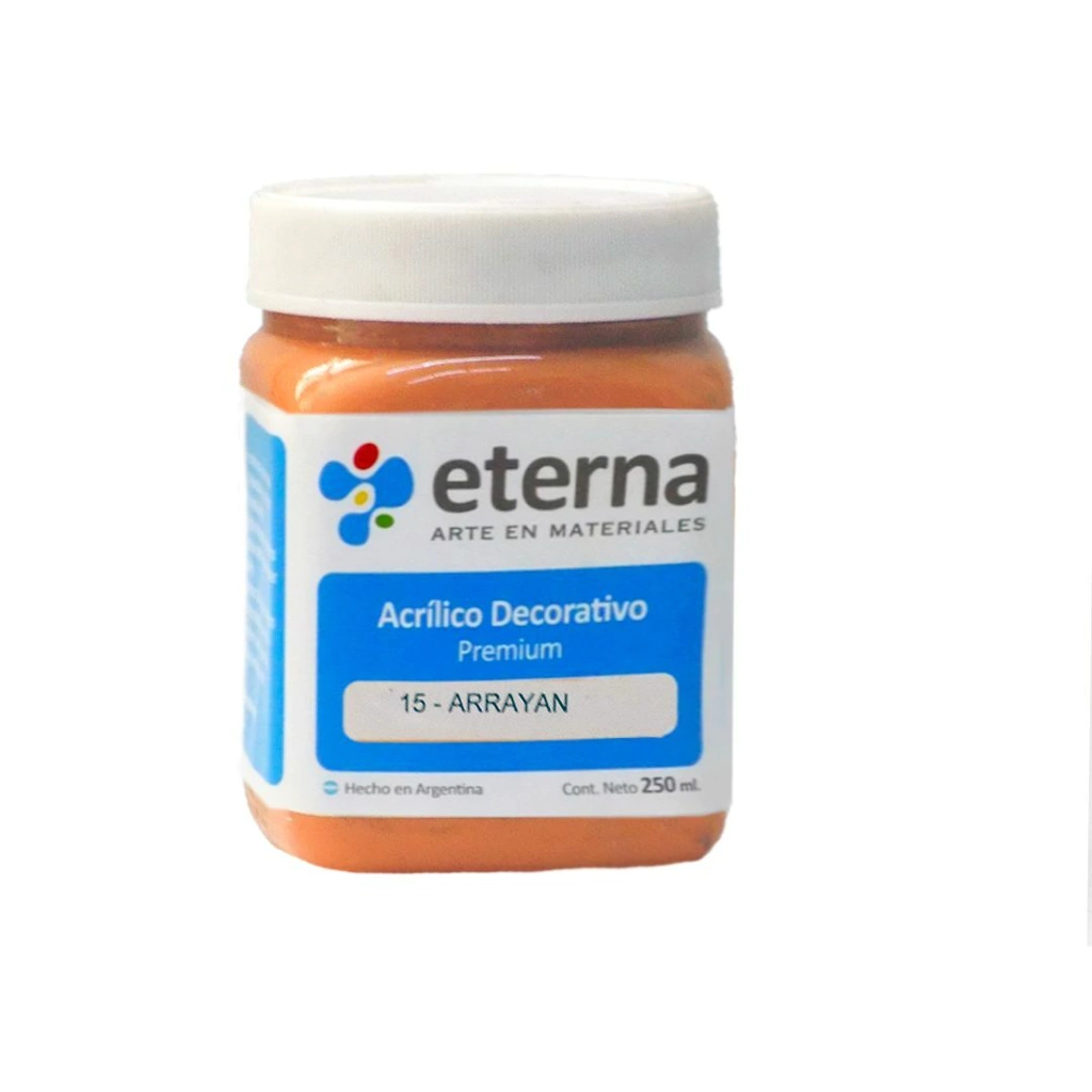 Pintura especial para decorar piezas de yeso, cerámica, madera, papel, cartón, etc. Elaborada con resinas acrílicas puras (garantizado) y pigmentos muy luminosos y de colores inalterables con el tiempo. Se diluye con agua o preferentemente con Barniz y Diluyente Eterna. La película una vez que se seca resiste la limpieza en seco y húmedo.