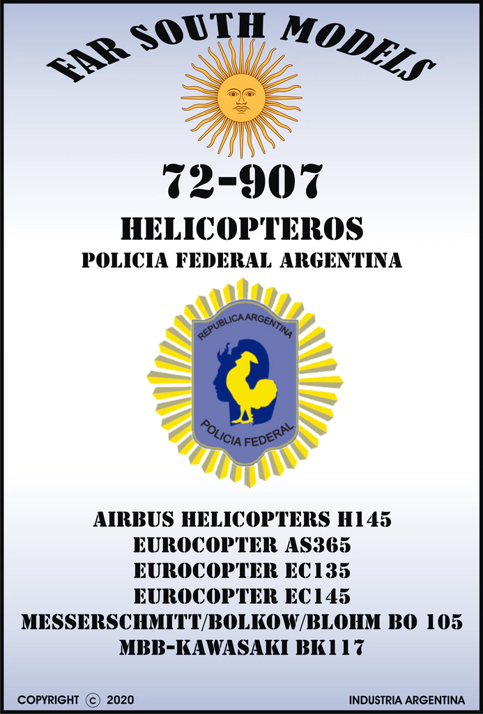 Plancha de calca en escala 1/72 referida a los helicópteros de la Policía Federal Argentina.