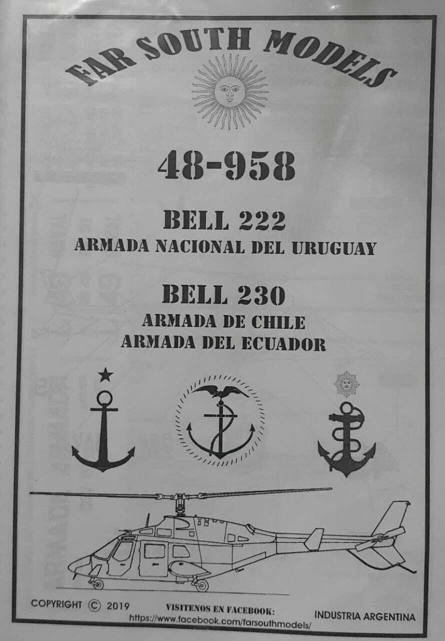 Plancha de calcas en escala 1/48 referida a los aviones de la ARMADA NACIONAL DEL URUGUAY 48-958 BELL 222 / BELL 230 ARMADA DE CHILE y ARMADA DEL ECUADOR