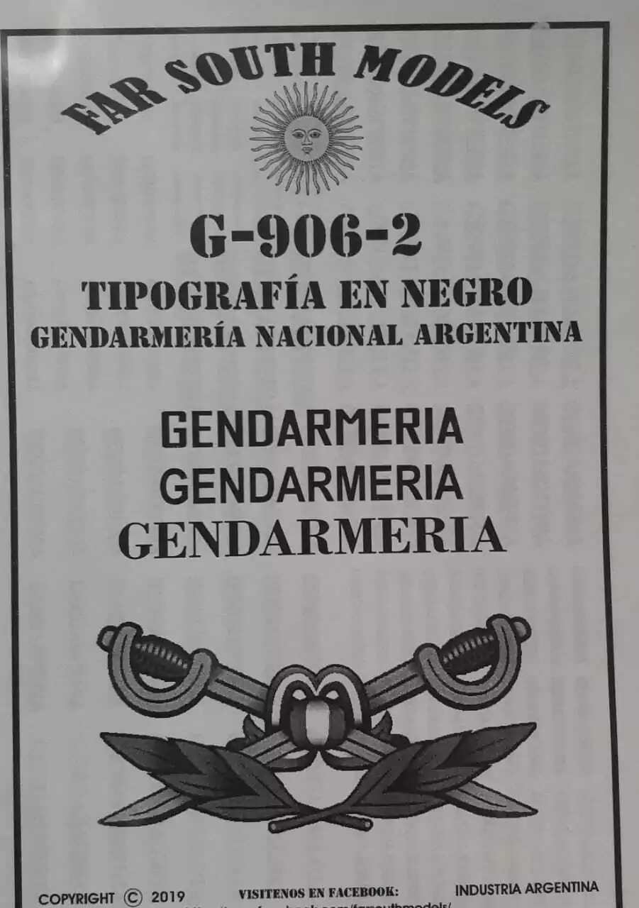 Plancha de calca con opciones de decoracion referida a la GENDARMERIA NACIONAL ARGENTINA - TIPOGRAFIA EN NEGRO G-906-2