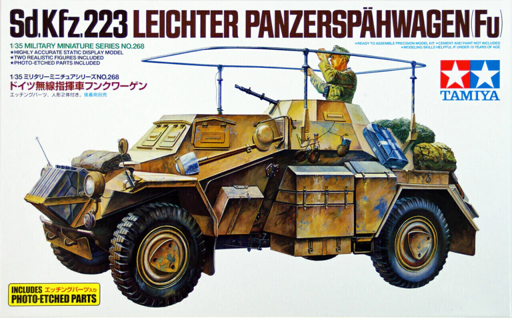 El vehículo blindado alemán Sd.Kfz.223 era un vehículo de mando y reconocimiento 4x4 de alto rendimiento y larga distancia, equipado con una antena de gran tamaño. Se presenta como una maqueta de plástico para ensamblar, con malla fotograbada de alta calidad para un acabado más realista.