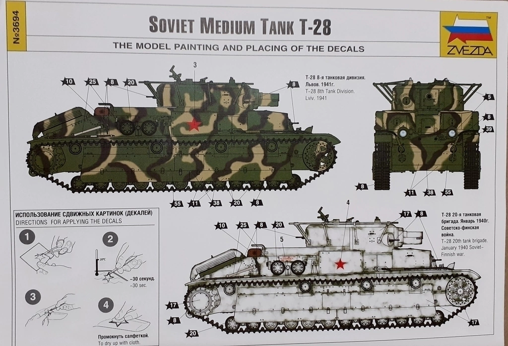 Maqueta de Zvezda en escala 1/35 del carro de torres multiples T-28 del principio de la Segunda Guerra Mundial Torretas orientables Suspension independiente Portezuelas abiertas o cerradas Orugas por eslabon y tramo Luces transparentes Opciones de calcas 4 Longitud 210mm Piezas 450